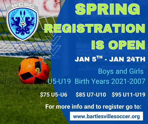 Jan 09, 2023 -- WCSC has field sign sponsorship opportunites available this spring. Sponsorship is $600 for the first year and $500 for subsequent years. Send email to publicrelations@bartlesvillesoccer.org if you are interested. ... read more »